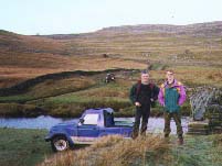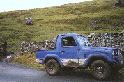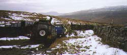 Now Turbury Road, what can you say, this is what greenlaning is all about for some. High up on the fells, miles from any houses, absolutely quiet. This is the road used by the hardened pot-holers, and if you keep your eyes peeled you'll see the small entrances into the caves, just to the left and right as you progress. After several miles we came towards the end of the lane only to find the way through the gate blocked by a couple of very large boulders. Not being one to put up with illegal obstacles on public roads I soon got the winch into operation [Photo left] and shifted one of them. We followed the dry-stone wall until we turned right through the gate and dropped down the hill-side past Yordas Caves [Photo right], then onto tarmac once again. |