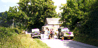 .. He was wrong [see photo top left], he got halfway across then he ground to a halt, he had no traction and had sunk - he wasn't going anywhere. Luckily we were all equipped with winches, Mike hooked onto me and slowly but surely extracated himself. Eventually we all got through and continued until we reached the forest, it had been raining hard and the undulating lane was waterlogged causing deep water-filled trenches, unfortunately water and V8's don't go together and Mike came a cropper again [photo left], his engine cut-out and refused to restart until he'd sprayed the electrics with copious amounts of WD40 Several lanes later the sun was going down, time to make camp [photo right], put the tent up, get the fire going, stoves out and start making the curry ( well somebody's got to eat it ). Imagine the atmosphere .. once you've tried it you realise you can't beat it.