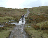 We took a shortcut on a previously researched road that took us onto Cam Road, another easy lane with a stoney surface - this a ratione tenurae road, its status not in doubt. There were still plenty of standing puddles from previous weeks rain (see left) but they presented us with few problems. Once onto Cam High Road we turned south towards the viaduct, we driven this road many times before but didn't have time to ride the full northerly route - we were eager to get on to the Highway. Cam High Road goes right through Gayle Beck at the southern end which can be quite daunting after a lot of rain, but on this occasion was reasonably shallow (see right - afterhaving ridden through the beck). |